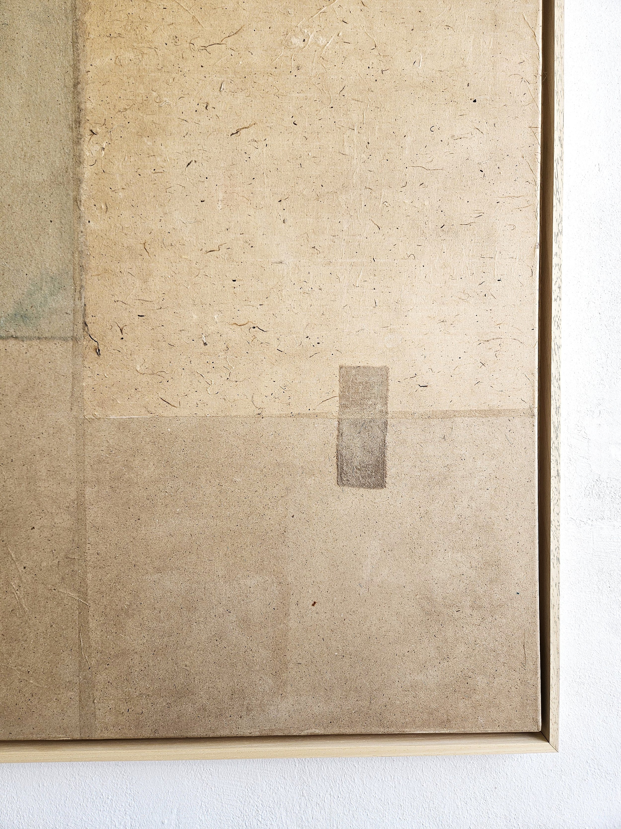 For this work a cotton canvas was hand dyed with walnut, layers of indigo fabric, paper and earth pigments make sure you will discover something new every time you look at this timeless piece.